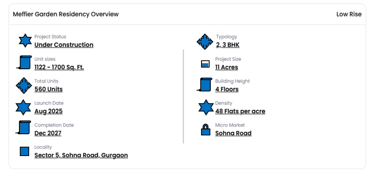 Meffier Garden Residency is a RERA-Approved premium low-rise builder floors located in Sector-5, Sohna, South of Gurgaon. Expand across an 11-acre land parcel in Phase 1, the project is planned as a low-density township offering garden-facing residences with approx. 45 ft setbacks and fully done-up 2BHK and 3BHK units. The configurations start from 1250 sq. ft., priced from ₹1.25 Cr onwards*, along with larger 3BHK + 3T floors (179.36 sq. yards) priced at ₹1.75 Cr approx.* Designed with elegant interiors by Godrej, the project features a 40,000 sq. ft. clubhouse and a 2-acre recreational zone for leisure and community living. Excellent connectivity via the Gurgaon–Sohna Expressway (NH-248A), Mumbai Expressway, KMP, and upcoming links such as Sector 63A, Golf Course Extension Road, Orbital Corridor, and WDFC enhances its location advantage. With key facilities like Vardaan Hospital (3 minutes) and GD Goenka School (6 minutes) nearby, along with a flexible 40:30:30 payment plan, Garden Residency offers a premium lifestyle with strong future appreciation potential.