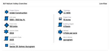Exquisite BLF Floors Sohna offer luxurious homes designed to meet modern needs with spacious interiors, top of the line materials, and facilities. Residents of this housing complex enjoy the combination of a beautiful landscape and modern clubhouse services available close to the gated entrance that enhances lifestyleworth. BLF Nature Valley residents enjoy urban facilities such as educational institutions, medical services, supermarket complexes, and recreational amenities strategically located which makes access easy due to the ideal position.